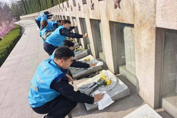 参观结束后,师生们走进英雄烈士墓区,297位英烈长眠于此,其中127位是无名烈士。全体师生整齐列队,神情肃穆,向革命英烈默哀致敬。在庄重的乐曲声中,师生们依次向烈士敬献鲜花,朵朵菊花寄托着对革命先辈的深切缅怀和崇高敬意。祭奠仪式结束后,师生们俯下身子,手持毛巾,仔细擦拭每一块墓碑,让英雄的名字一尘不染。阳光洒在花岗岩碑面上,那些被岁月风雨侵蚀的字迹依然清晰可辨--籍贯、姓名、牺牲时间,每一行文字都镌刻着一个年轻生命的全部重量。一位学生党员轻抚着一位年仅19岁的烈士墓碑,久久沉默。这些长眠于此的先烈们,牺牲时大多只有二十出头,正与在场的青年学生们同龄,青春与青春的对话,在此刻跨越了时空的阻隔。一名学生入党积极分子说:“擦拭墓碑时,我看到一位英雄烈士牺牲时年仅19岁,和我现在的年龄一模一样。他用生命换来了我们今天的和平与安宁,我们没有理由不把这份来之不易的幸福守护好、建设好。”